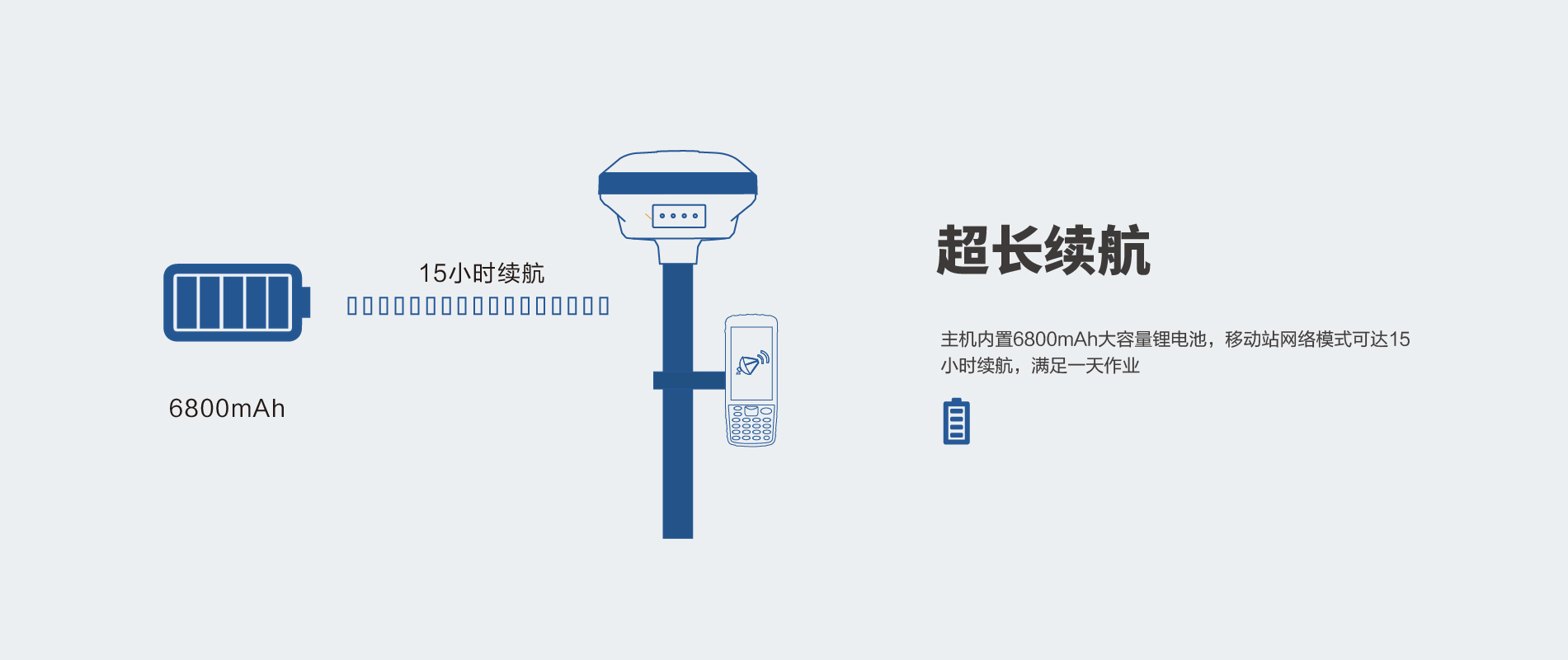 內(nèi)置6800mAh鋰電池,支持移動站15小時續(xù)航 |